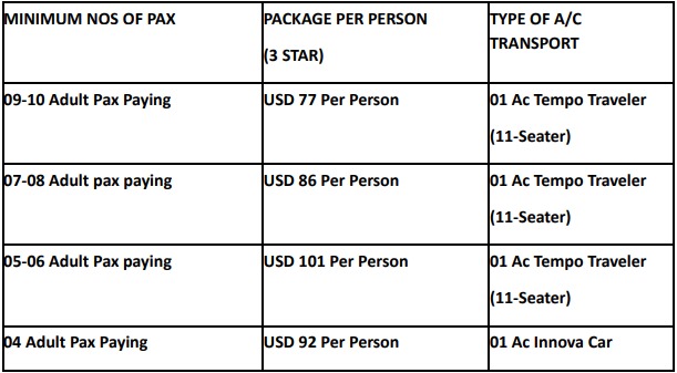 Airport Tax, Any Air/Train fare, Liquor, Laundry, room service, Phone call, Any increase in Govt. Taxes, camera (still / video) entry fee, Tips to driver and guide. Any extra expanses occurring due to delay / cancellation of flight or any other change which is beyond our control. Monuments Entry Fee, Any Lunch and Dinner.