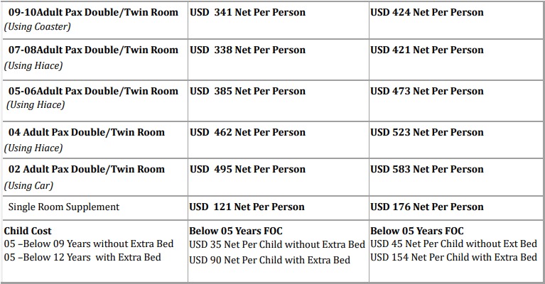 LAND COST AS UNDER BB Basis : (USD PER PERSON) for Srilankan passport holders.